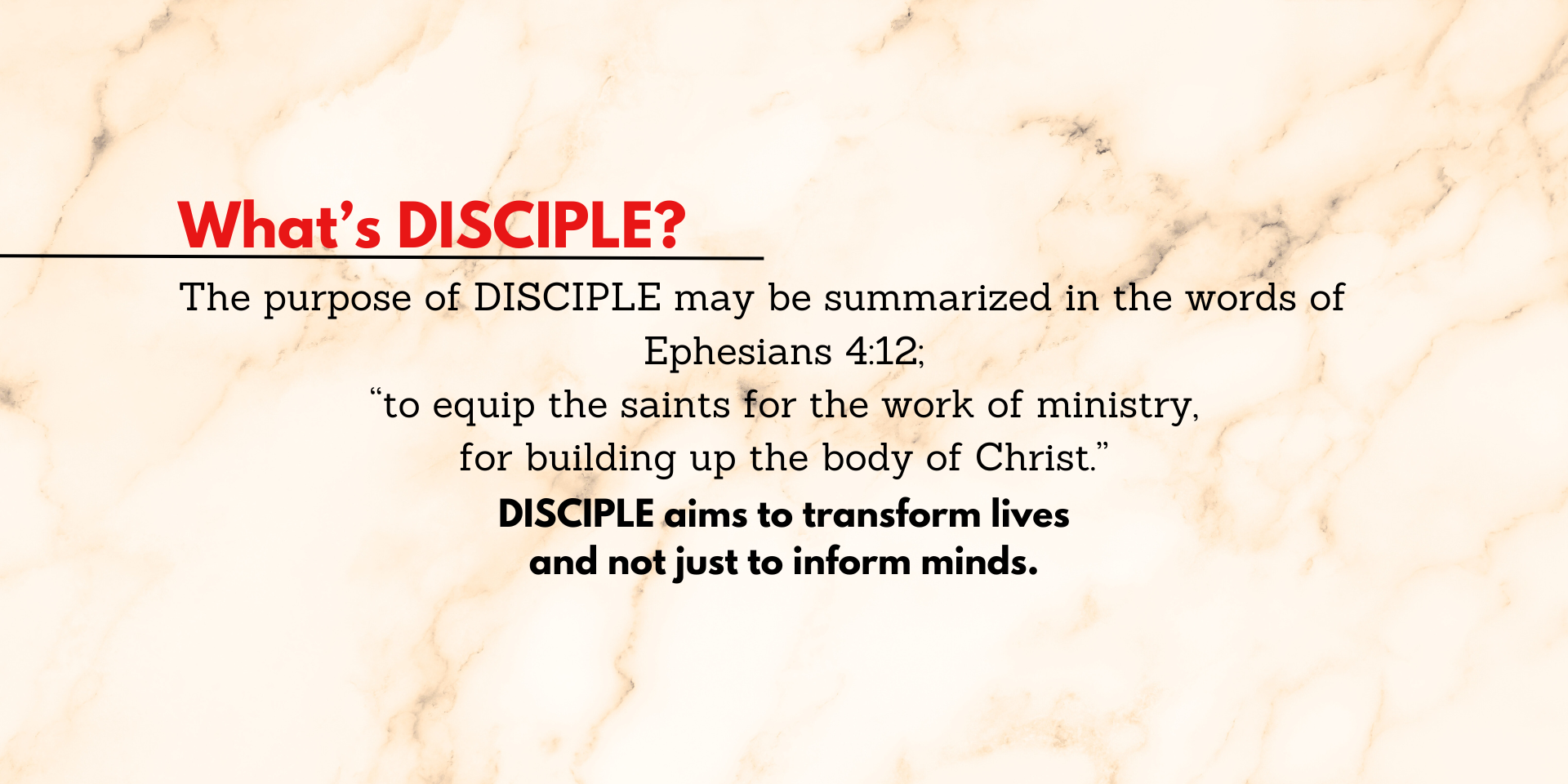 Disciple Bible Study is a programme of disciplined Bible study aimed at transforming lives. The study gives the Old and New Testaments equal time, emphasizing the wholeness of the Bible as a revelation of God.